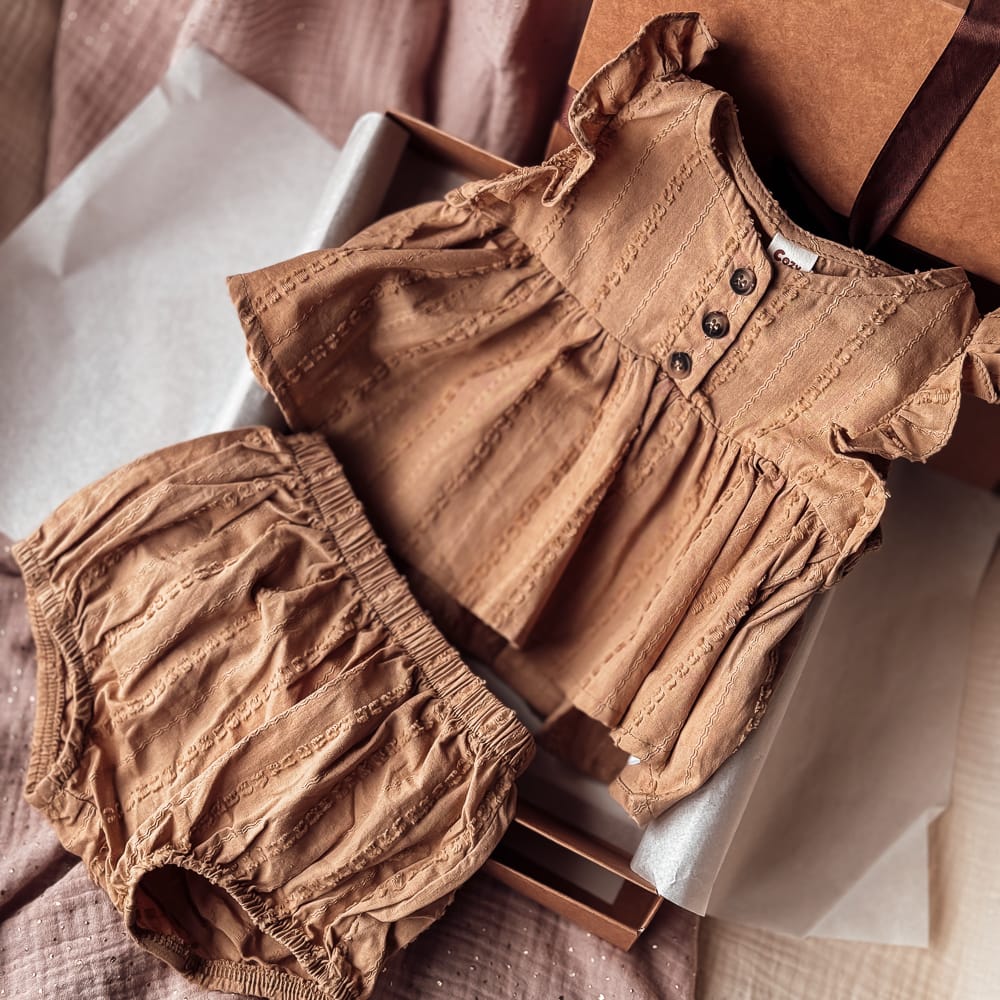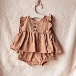 Mielai stilingas dviejų dalių medvilninis komplektas iš palaidinės ir šortukų.