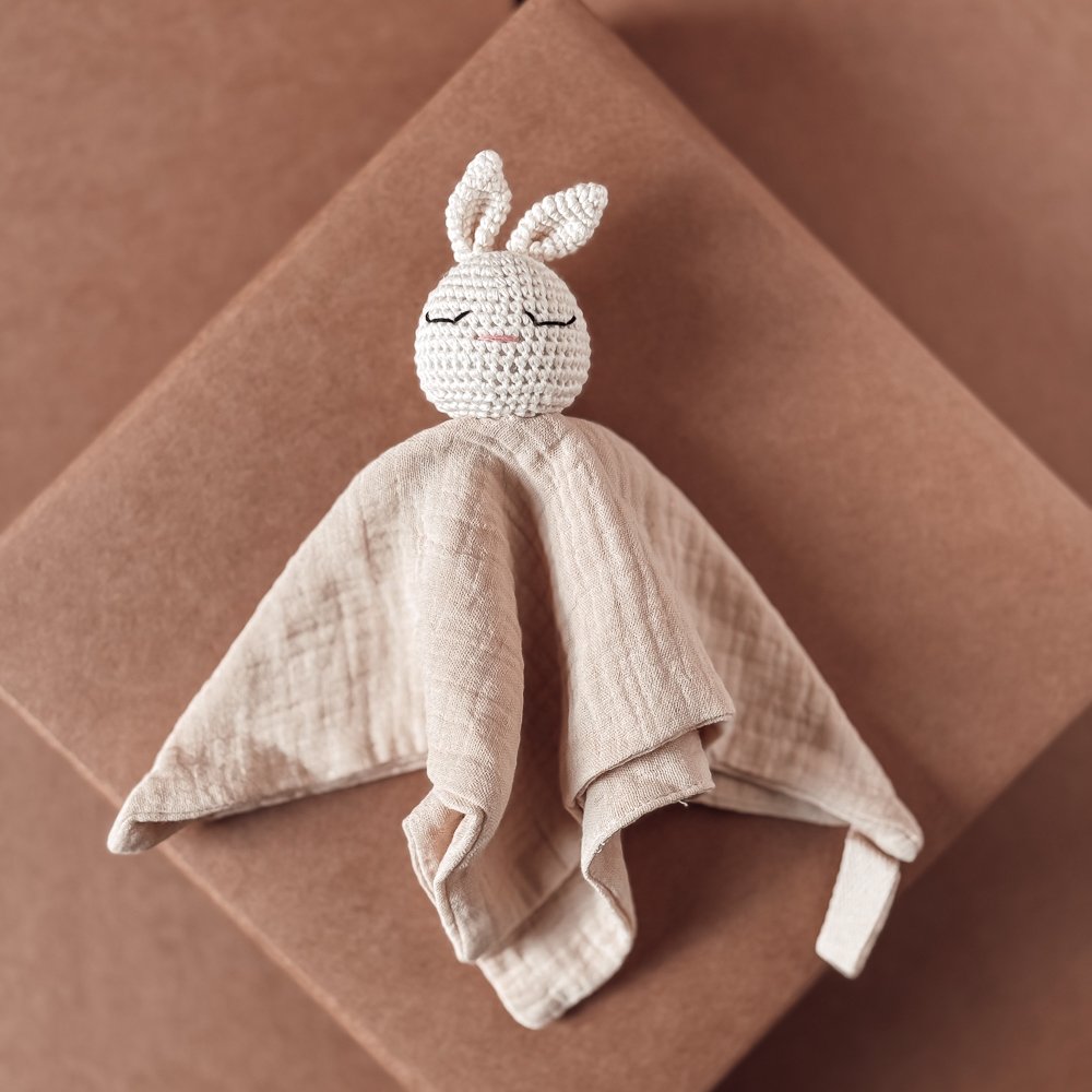 Švelnus ir mielas, muslino medvilnės migdukas su žaviu megztu zuikučiu yra tikras saugumo ir jaukumo šaltinis jūsų mažyliui nuo pat pirmųjų dienų. Tai ne tik praktiškas aksesuaras, bet ir jauki rūpestinga dovana naujagimiui.