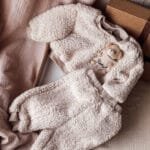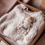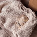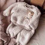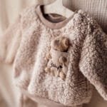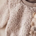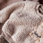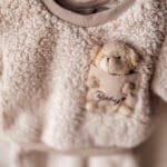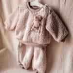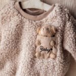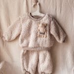 Pliušinis dviejų dalių laisvalaikio komplektas, kurį sudaro bliuzonas ir kelnės. Su žaviu meškučiu kišenėje.