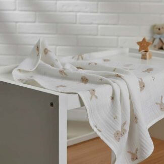 Smėlio spalvos muslino medvilnės pledukas – stilinga, jauki ir praktiška dovana.
